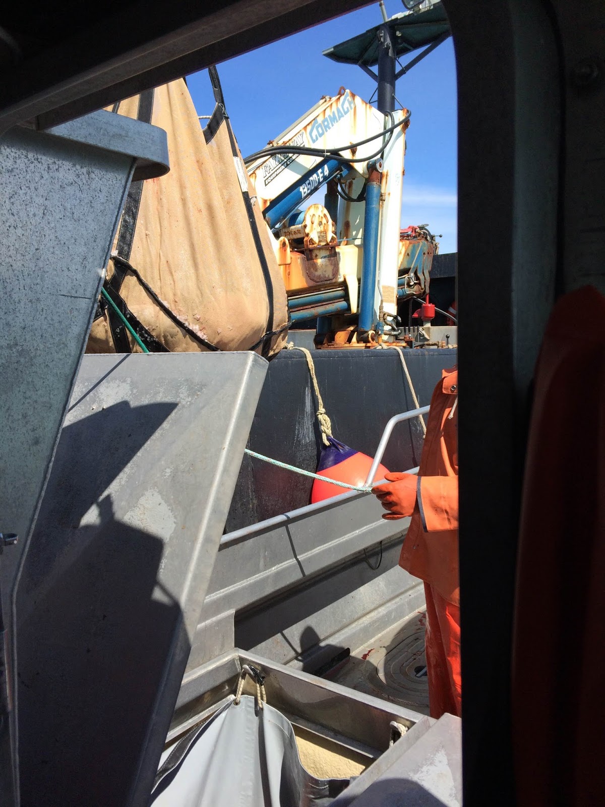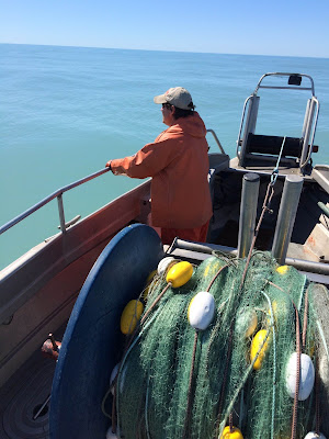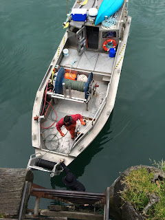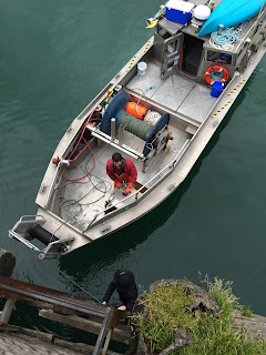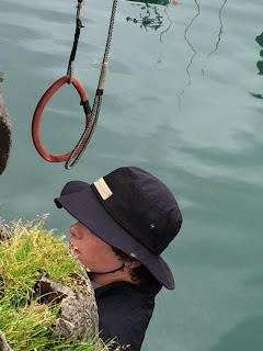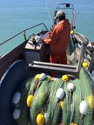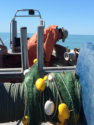 I am always so relieved when Aquaman and The Wrecking Crew are back on shore. Not that it means the danger passes. We are constantly engaged in difficult tasks on and around the water. Something that sounds simple - like loading a repaired net onto the boat - is not simple at all. It is scary. It involves cranes and ladders down incredible vertical drops at low tide with really cold water.