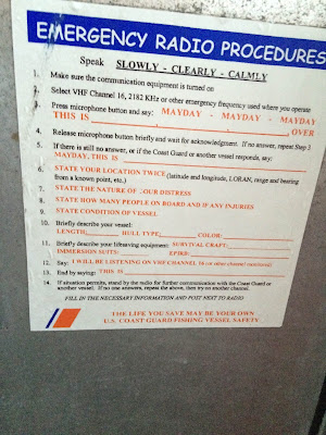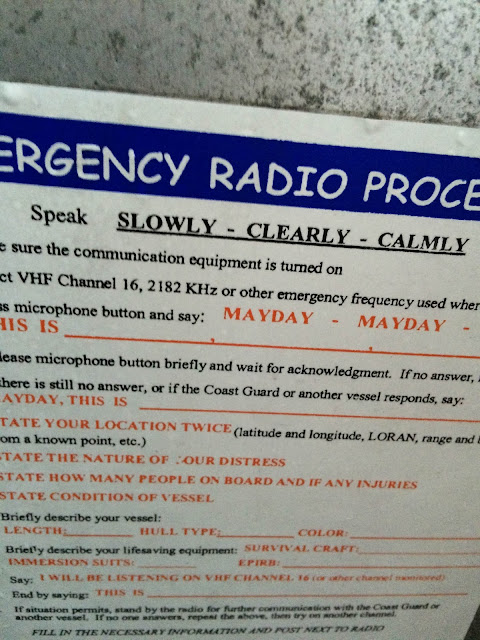 My stomach knotted a bit as I read through the Coast Guard Emergency Radio Procedures. Then I yelled some more questions to Aquaman about the radio and how to use it (Channel 16, folks -- I do remember that at least from my CB days on family road trips in the 1970s), and about his GPS and what the MOB button is for. Man Overboard, that's what it's for. That's what I hope never to need. It records the latitude and longitude where you are at the precise and horrifying moment so that you can get back to the person to look for them in the general location where they fell off.