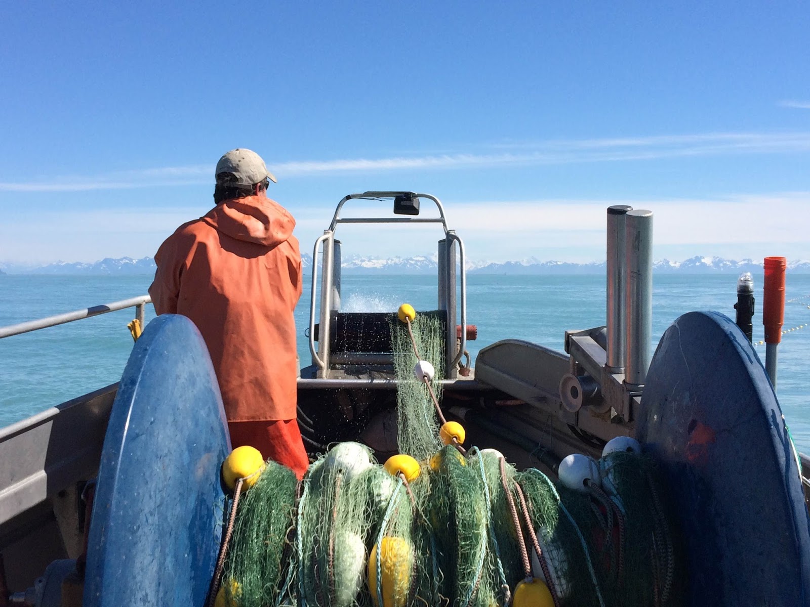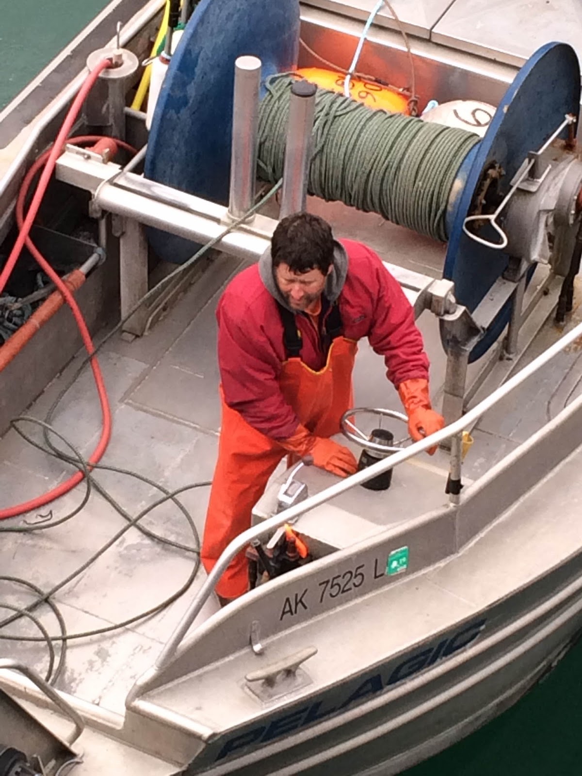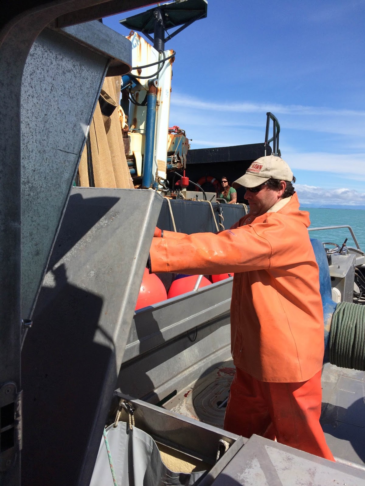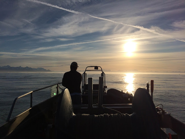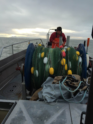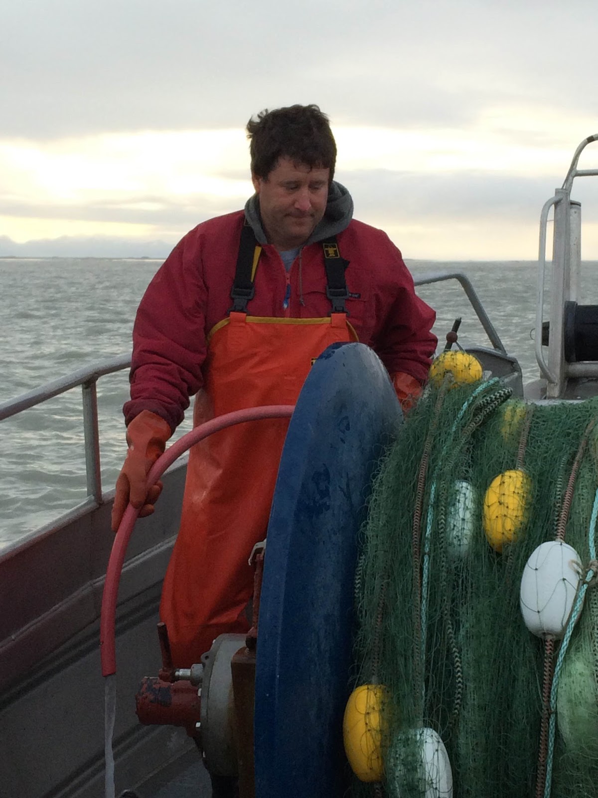 I watched the sunrise. I watched Aquaman make all of his preparations - getting in to his raingear (full bibs, jacket, Xtra Tuf waterproof boots and waterproof gloves), cleaning the fish holds one more time, lining them with the brailer bags (kind of like enormous mesh shopping bags to hold the iced fish once caught), checking in with his group on the radio, getting the buoys attached to the net staged and ready to go over the bow roller, and counting down the seconds to 0700. Then he dropped his net in the water.